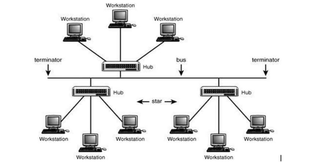 Bus Topology is one of the oldest connection technologies. In Bus Topology, one computer should be at least 1m away. It can be extended with extension. The bus uses 10 base 2. 10 base 2 means 10 means speed (10 Mbps) and 2 means distance 185m. Buses use terminators with both ends off.